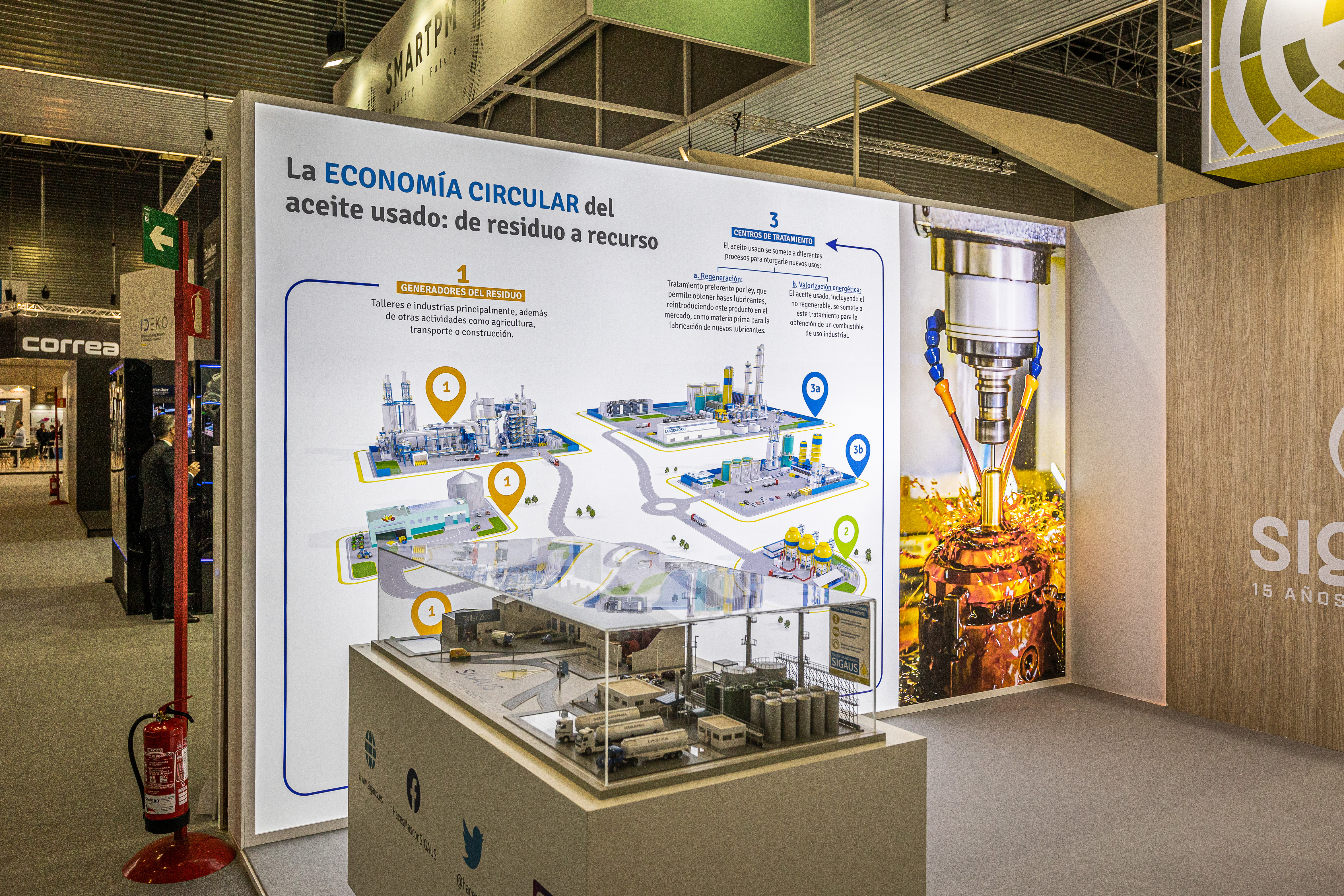 Desde su stand situado en el Pabellón 1, SIGAUS ha informado a los visitantes, a través de distintos materiales explicativos y audiovisuales, acerca de la gestión del aceite usado en el ámbito de la industria, desde el papel fundamental que desempeñan los productores de este residuo para que pueda gestionarse adecuadamente, hasta las obligaciones que deben asumir las empresas que importan o fabrican aceites industriales o maquinaria que los contenga.