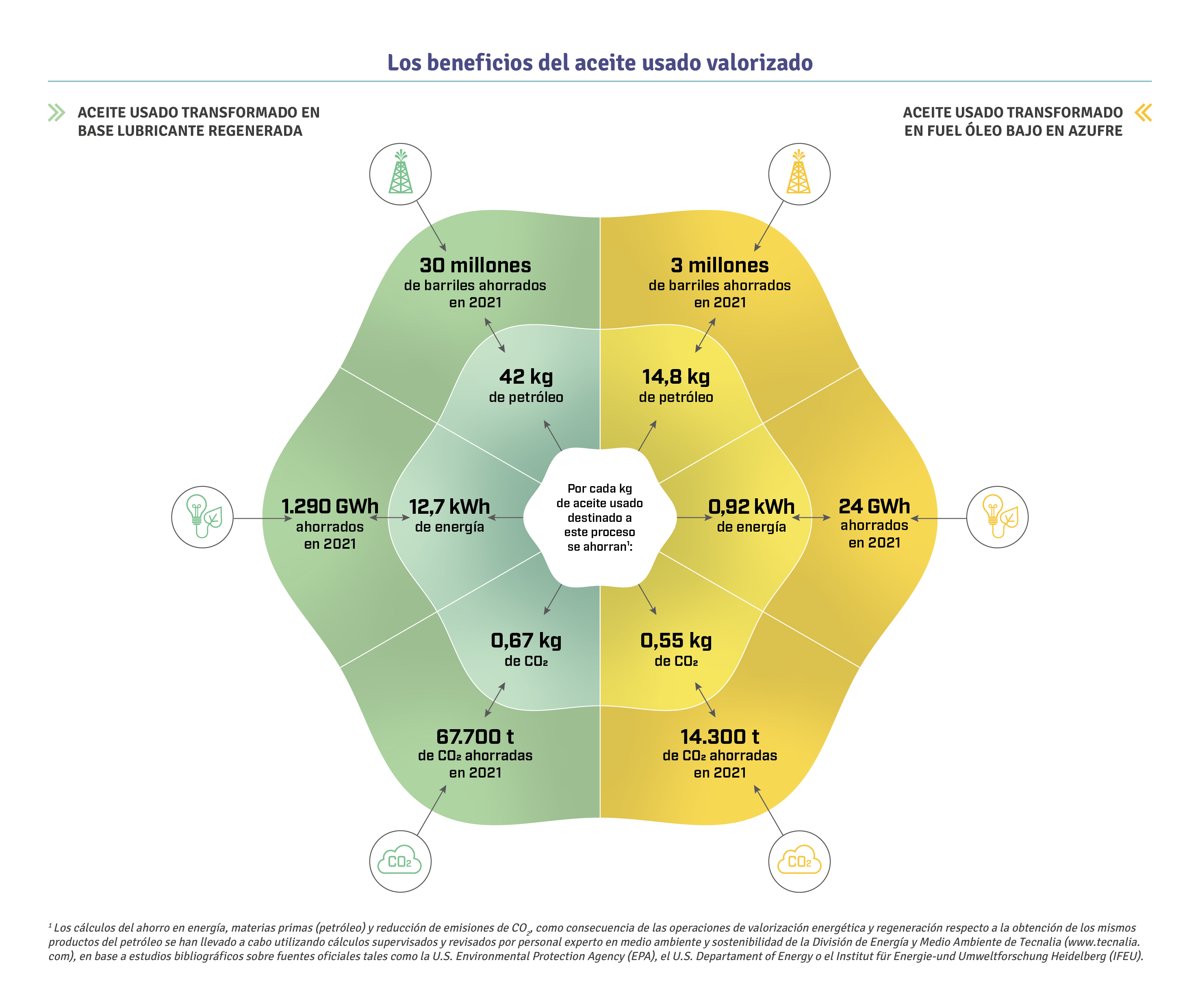 - 100% recovered used oil. Thanks to its extensive experience and knowledge of the sector, SIGAUS works with practically all operators in the management of used oils in Spain. The funding provided and the availability of two complementary treatments ensure that the waste can always be transformed into a resource, in an efficient manner, and with added savings in terms of energy, emissions and raw materials.