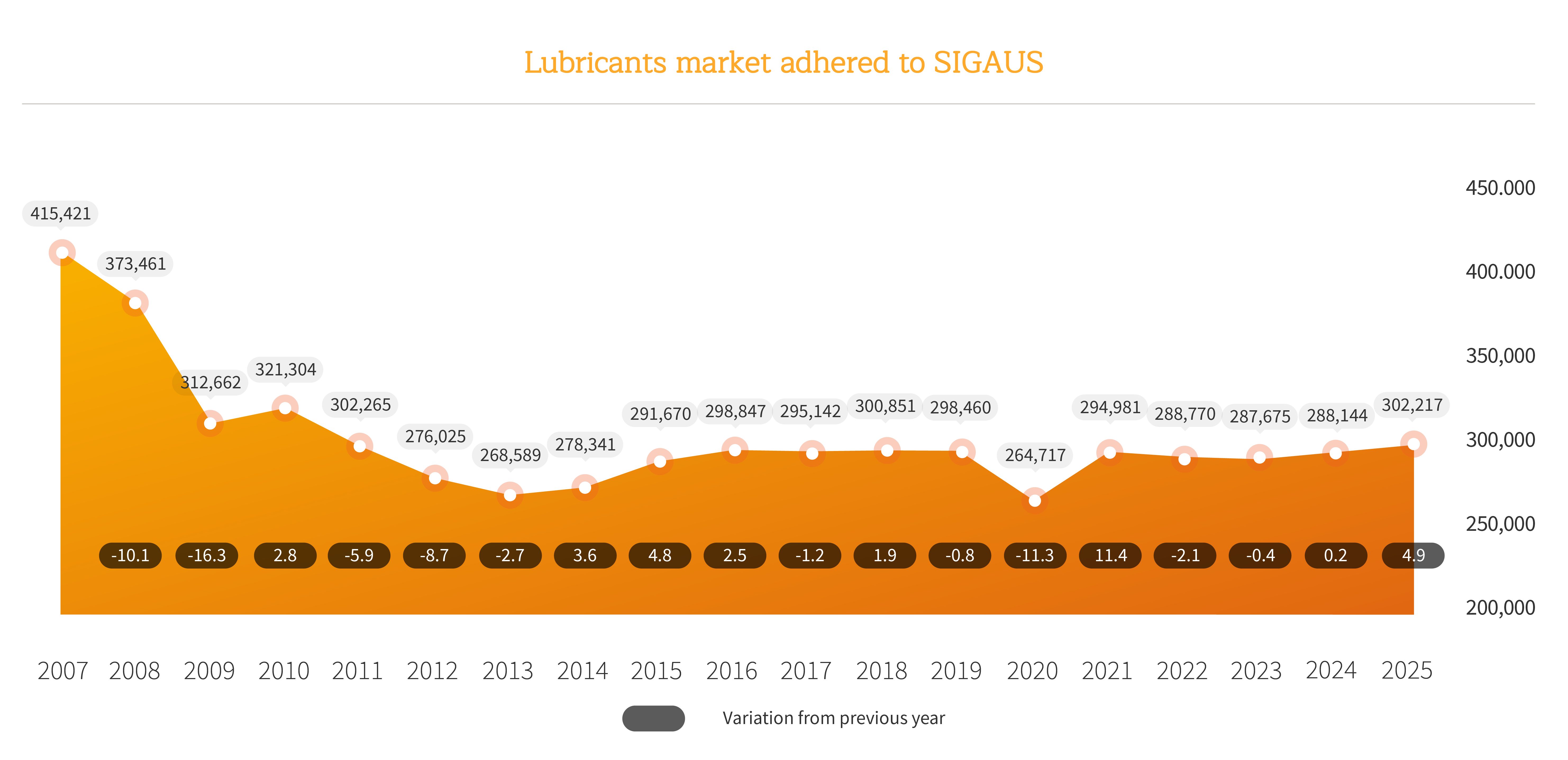 The volume of industrial oils adhered to SIGAUS grew by 4.9%, with the sale of 302,217 tons of industrial oil in the national market. The year began with strong upward momentum in the first quarter (+6.4%), which continued in the following two quarters, with increases of 4.6% and 6.7% respectively. Sales growth only moderated in the final stretch of the year, with an increase of 2.2%. By month, March and June registered strong growth, exceeding 10%, and only April, due to seasonal effects, showed a decline compared to 2024.