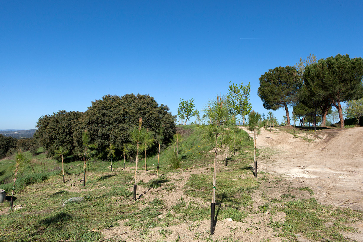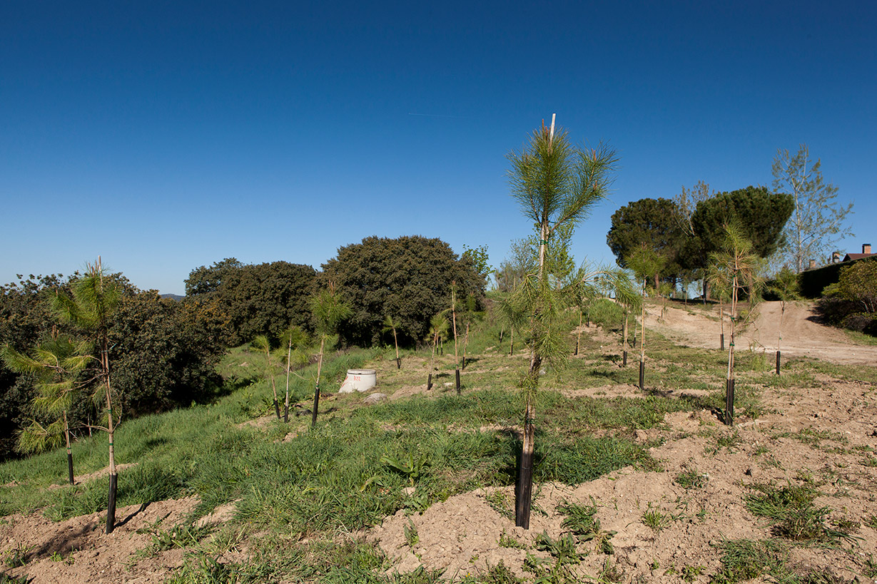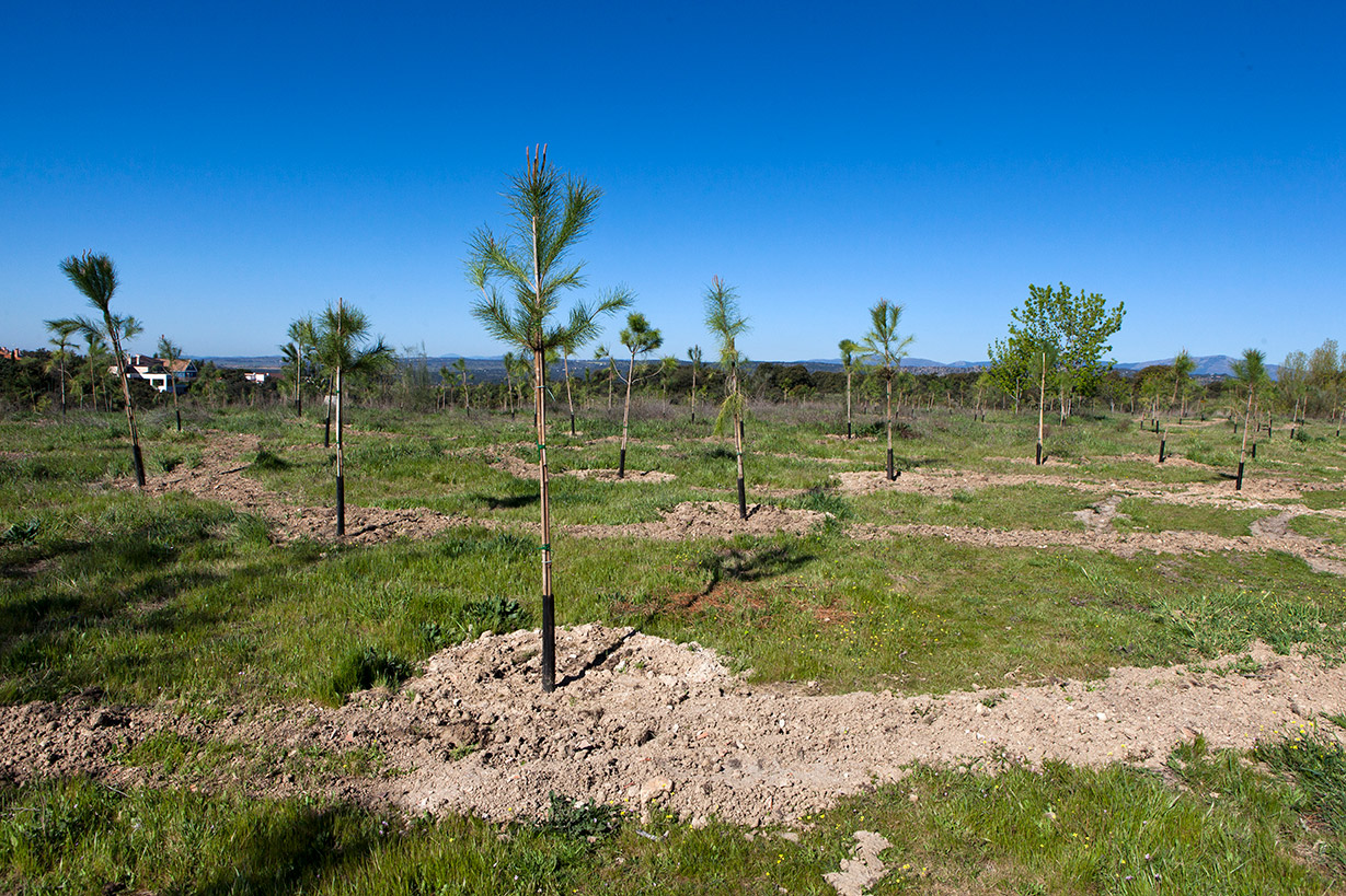 En un espacio de 32.439,18 m2 ya crecen mil pinos piñoneros, una de las especies que más toneladas de dióxido de carbono es capaz de absorber: 60 kg de CO2 a los 20 años por pie(12). Se caracteriza por ser un árbol muy resistente que aguanta bien la carencia de agua y las altas temperaturas. De crecimiento lento, puede alcanzar los 25 metros de altura y una edad media de 200 años. En estado adulto, este árbol se caracteriza por tener una copa redondeada y achatada en forma de sombrilla, muy útil para crear zonas de sombra.