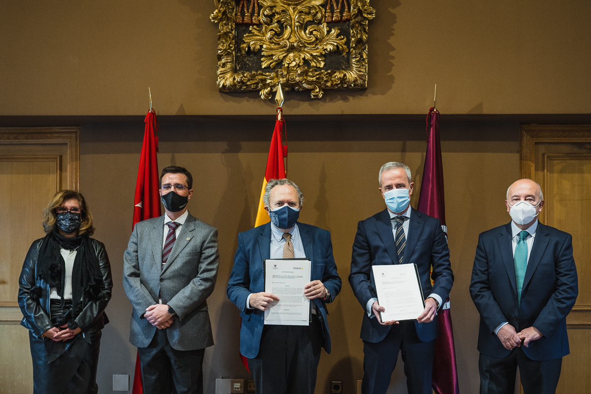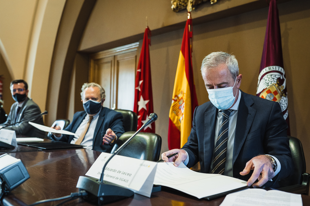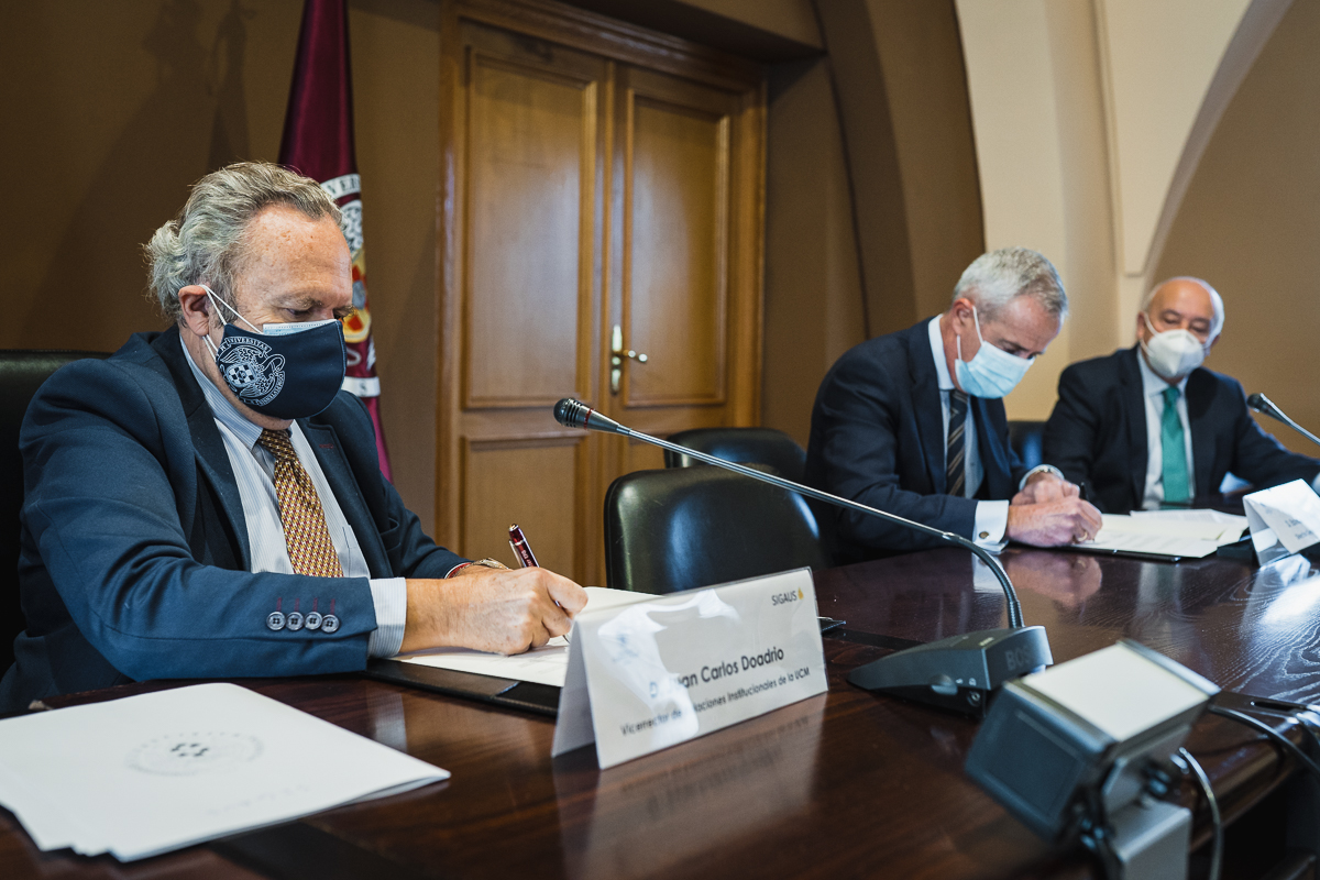 Durante el acto de firma en la sede del Rectorado de la UCM, Eduardo de Lecea y el responsable de RRII de la universidad estuvieron acompañados por su Vicerrector de Tecnología y Sostenibilidad, Jorge Jesús Gómez Sanz, a través del que ha sido posible que SIGAUS esté participando ya como docente en el Máster de Prevención de Riesgos Laborales puesto en marcha por este Vicerrectorado junto al Rectorado para la Promoción de la Cultura Preventiva, y que cuenta en su programa con una amplia carga lectiva relacionada con la gestión medioambiental.