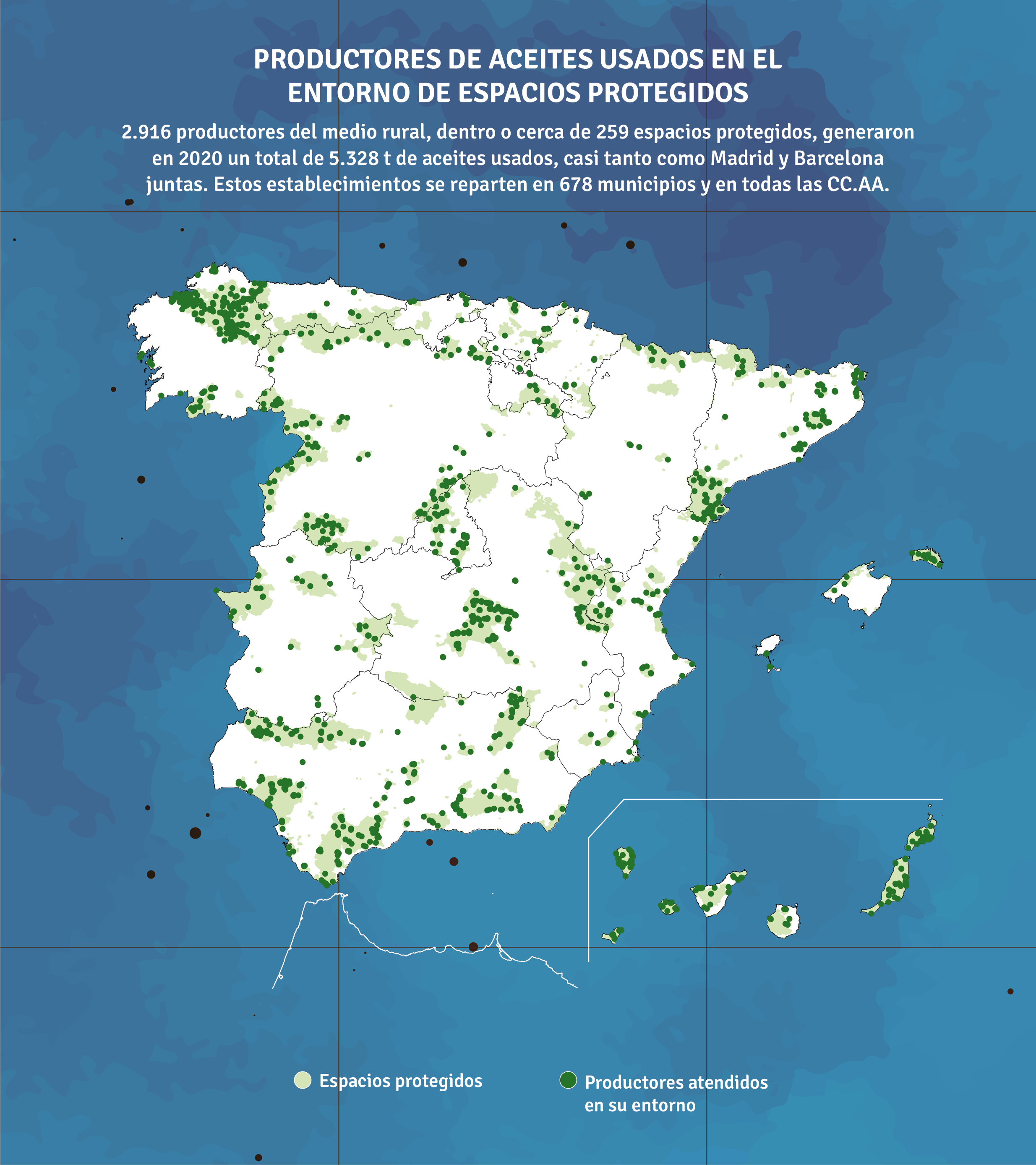 • Zonas despobladas: En España hay 5.000 municipios de menos de 1.000 habitantes. En casi 2.000 de ellos se generan aceites usados, incluyendo 853 localidades en grandes vacíos de población: menos de 500 habitantes y menos de 10 hab./km2. En total, en estos municipios se produce más aceite usado (6.586 t) que en las ciudades de Madrid y Barcelona juntas (5.762 t), pero de forma mil veces más dispersa.