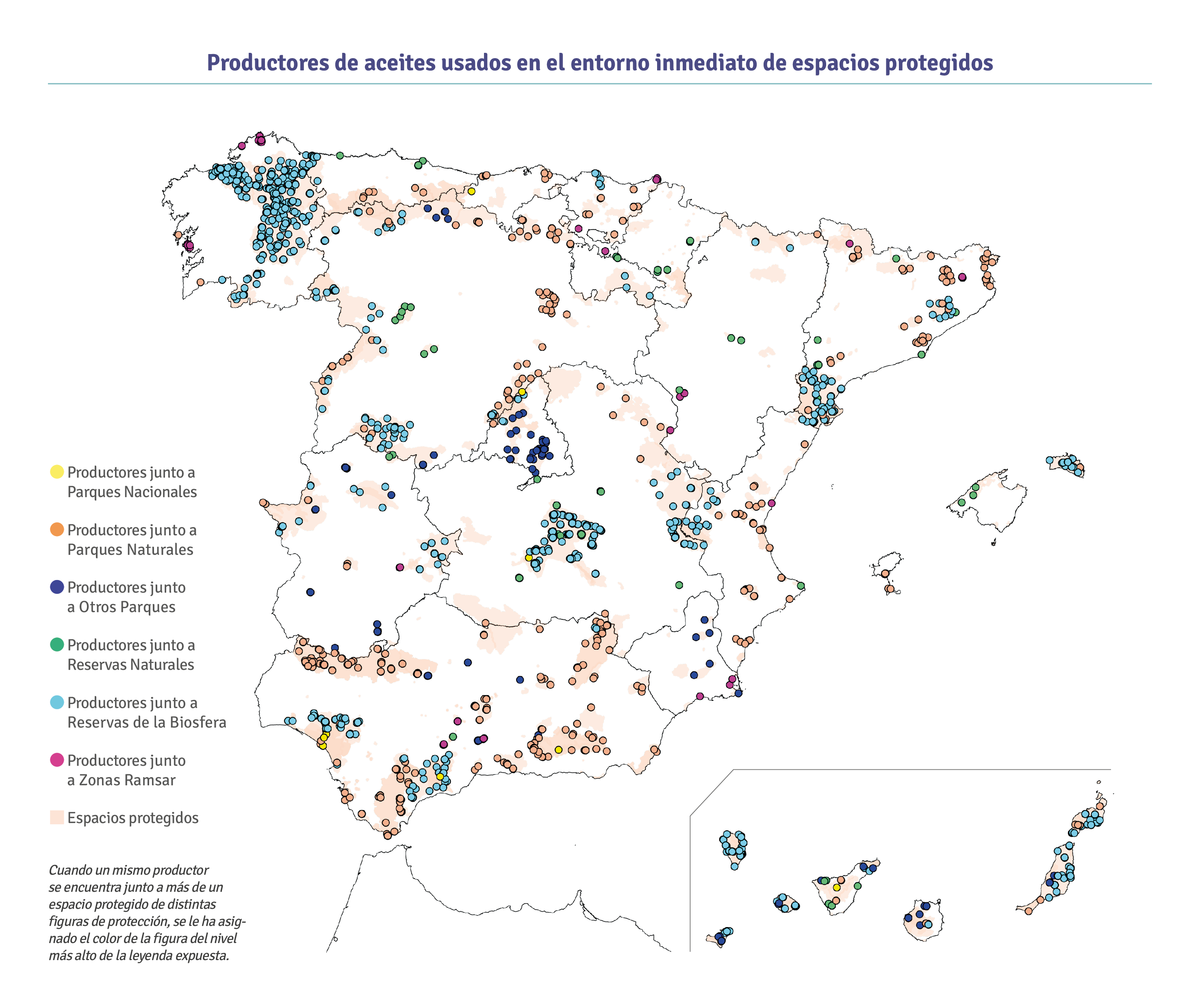 - Servicio esencial en zonas de alto riesgo ambiental. Más de 3.000 establecimientos de municipios rurales generaron unas 5.000 t de aceites usados en el entorno inmediato de espacios naturales protegidos. Se trata de recogidas en zonas de mayor vulnerabilidad, y que requieren un mayor esfuerzo logístico: el volumen medio por productor fue un 38% inferior a la media nacional.