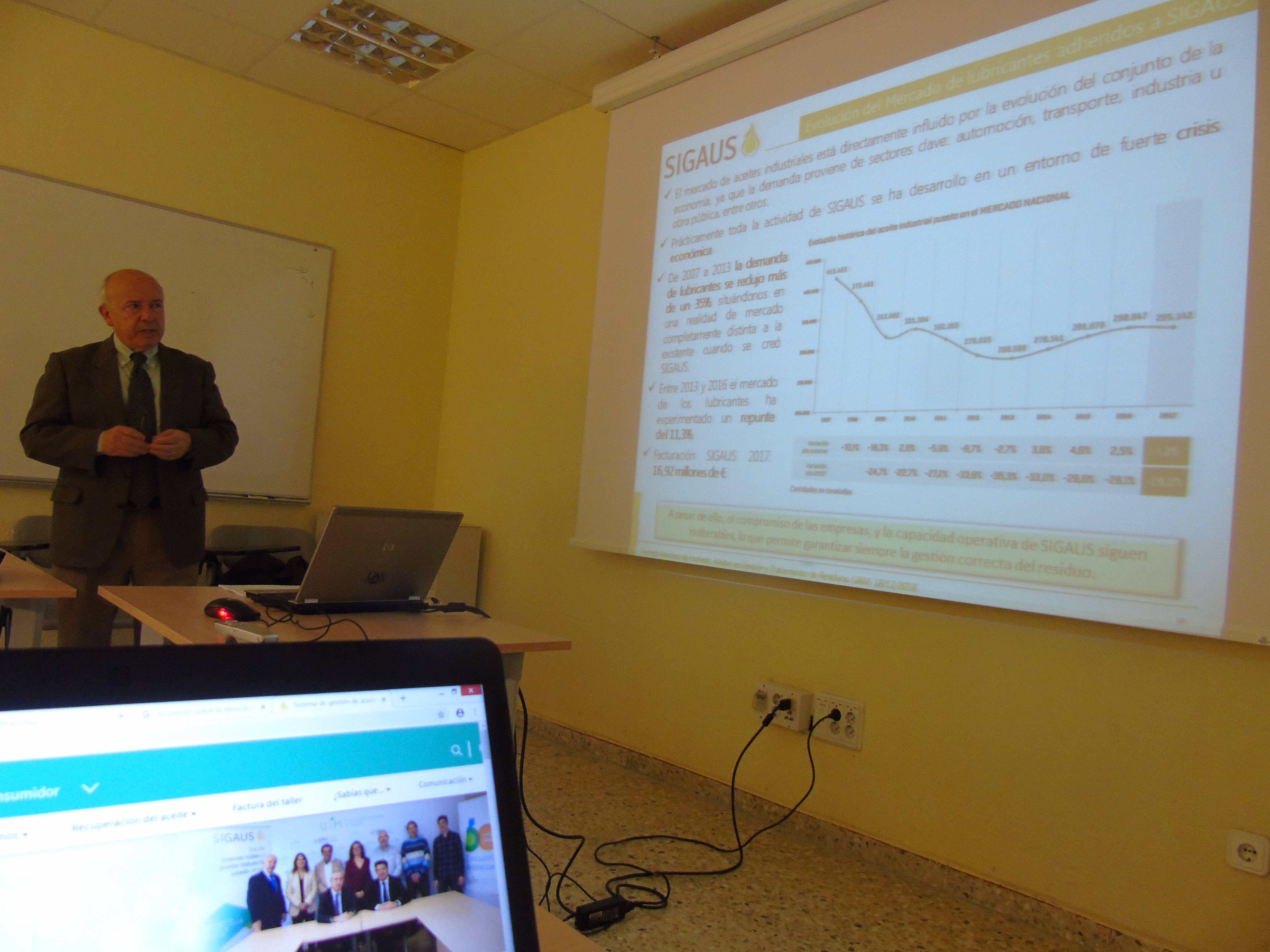 Precisamente con la UAM, SIGAUS está colaborando en el Master sobre Gestión y Tratamiento de Residuos que, como título propio, cuenta esta Universidad, y que este Curso 2018-2019 está desarrollando su 17ª Edición. A través de una Master Class de dos horas de duración, el Director de Relaciones Institucionales y Comunicación, Fermín Martínez de Hurtado, acercó a los alumnos de este Master los conocimientos relacionados con la gestión del residuo de aceite industrial, como parte de los contenidos programados en este Master y que contemplan, entre otros, los relacionados con el tratamiento de residuos industriales, vehículos al final de su vida util (VFU), residuos de aparatos eléctricos y electrónicos (RAEE), radiactivos, de construcción y demolición, sanitarios o plásticos.