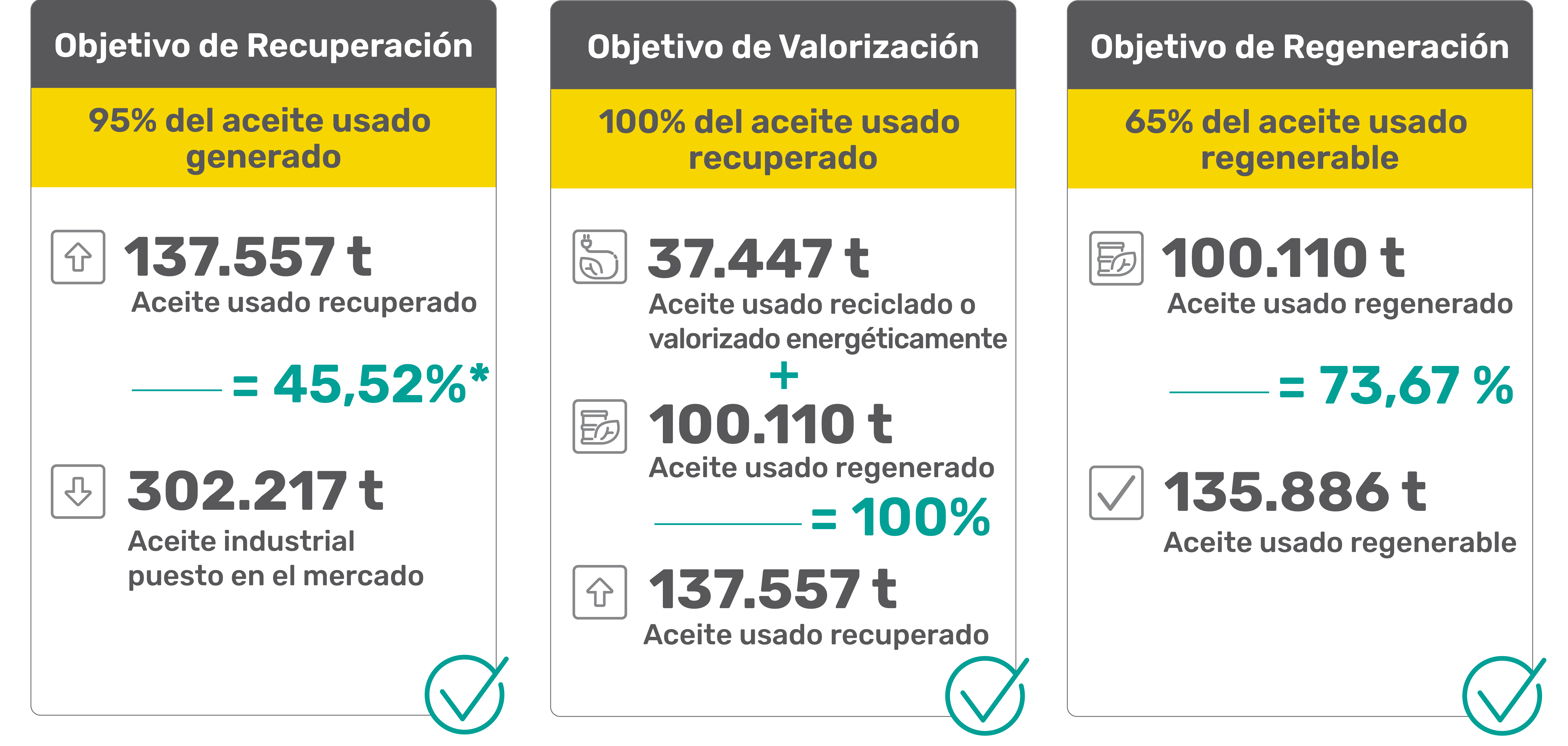 El 100% de ese aceite recuperado se aprovechó a través de distintos tratamientos. Casi tres cuartas partes del aceite usado regenerable (un 73,67%) se destinaron a regeneración, el tratamiento prioritario por ley, por el que se extraen de aceite usado bases lubricantes, lo que supone 8,7 puntos por encima del objetivo legal. Teniendo en cuenta el rendimiento medio de la regeneración, este tratamiento hizo posible la producción de cerca de 63.000 toneladas de nuevos lubricantes. El resto del aceite usado recogido fue tratado para su posterior uso como combustible, permitiendo la producción de más de 32.000 toneladas de fuel óleo.